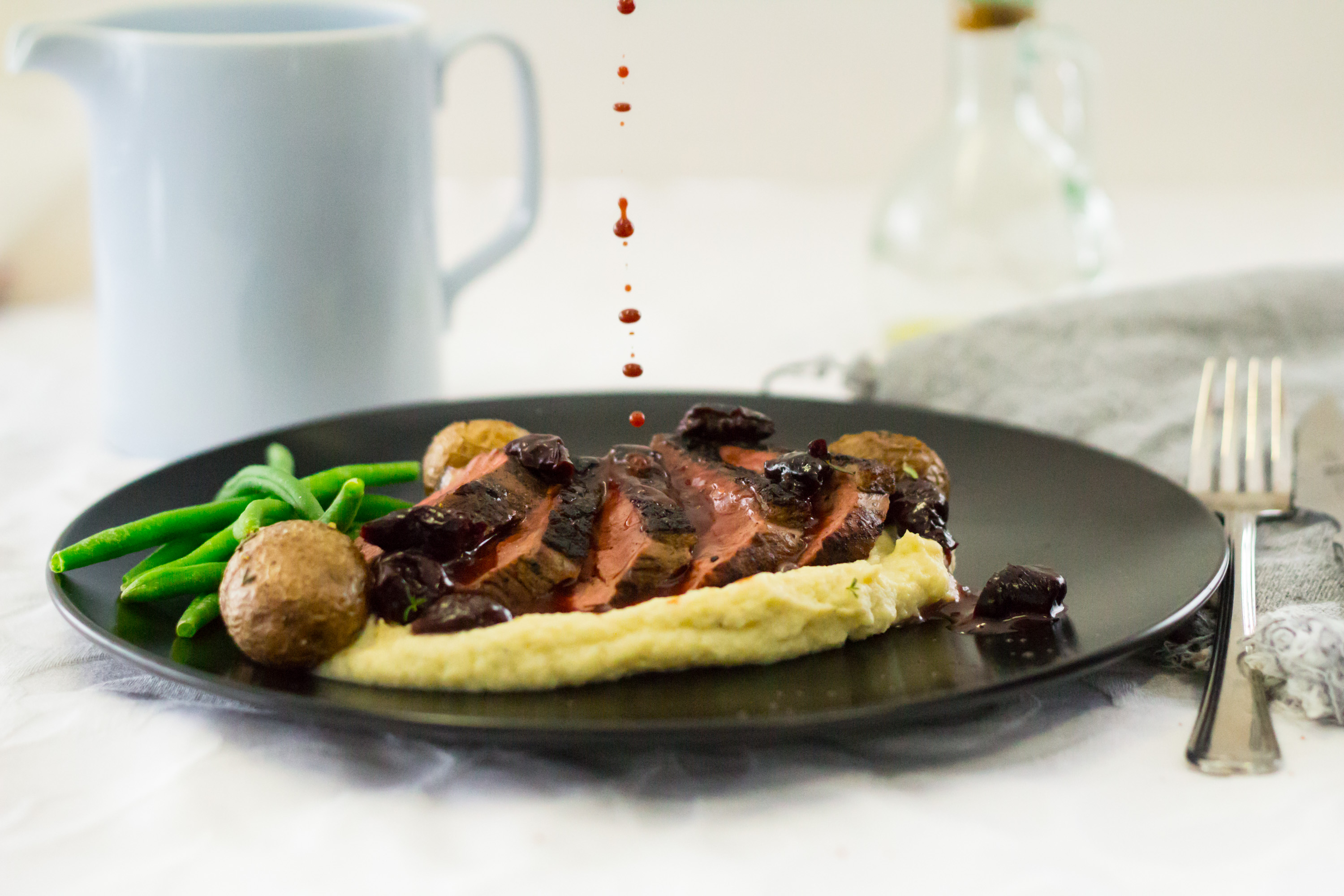 - Onglet de boeuf, purée de pommes de terre, légumes rôtis, jus au vin rouge